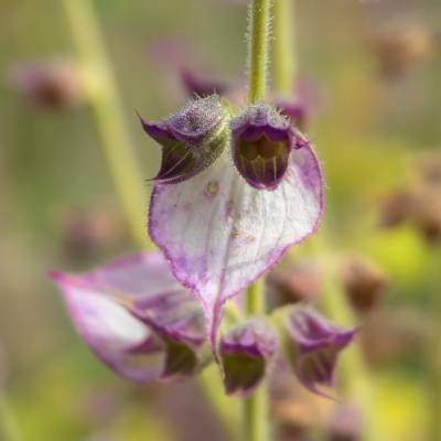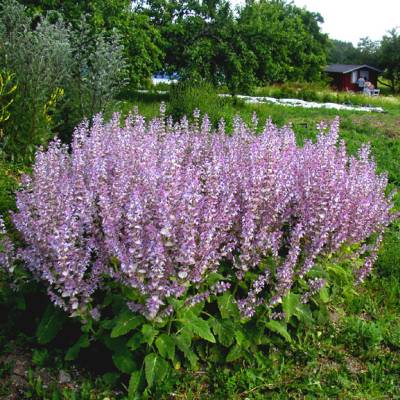 Bisannuelle, la sauge sclarée atteint 80 cm à 1,2 mètre de hauteur. Ses grandes feuilles ovales et gaufrées dégagent un parfum puissant et musqué. Les hampes florales portent des fleurs blanc rosé à lilas-violet