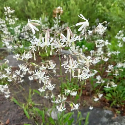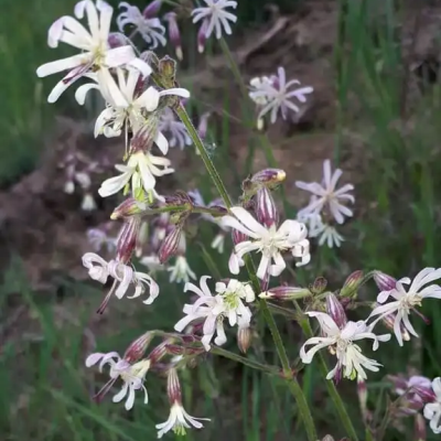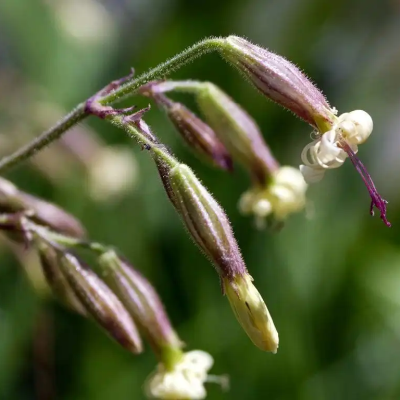 Vivace de 30 à 60 cm de hauteur. Feuilles velues et collantes au toucher. Fleurs penchées sur leur pédoncule, possédant un calice renflé veiné de pourpre et de cinq pétales blancs. Pétales enroulés le jour et s'ouvrant le soir